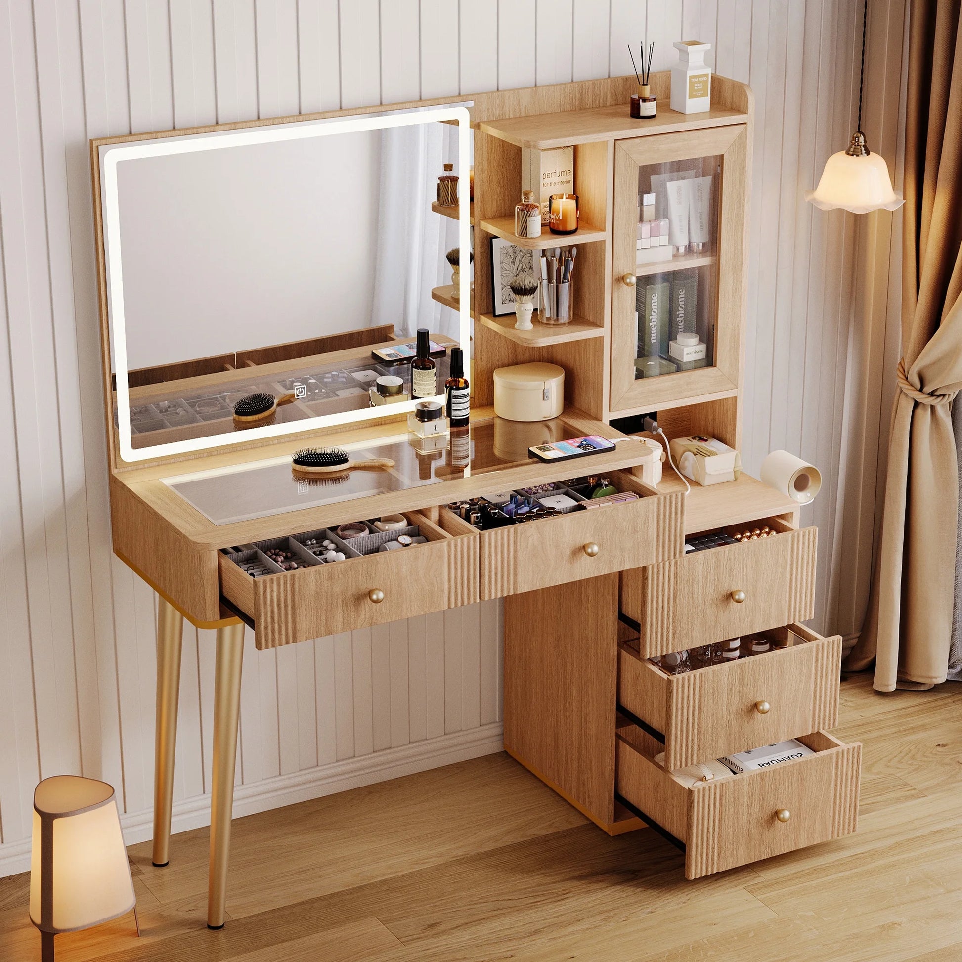 The LINSY HOME 48" Fluted Makeup Vanity Desk redefines your beauty space with a perfect blend of style, smart functionality, and ample storage.Featuring a large LED mirror with 3 adjustable color modes (warm, natural, and cool) and touch-control dimmable brightness, this makeup vanity ensures flawless lighting for makeup, skincare, and hair styling—any time of the day.Designed with 5 spacious drawers, an enclosed cabinet with adjustable shelves, and multiple open display shelves, it offers versatile storage for your cosmetics, hair tools, and accessories. With extra-deep drawers (7.2" depth), even larger items like hair dryers, curling irons, and skincare devices can be neatly organized.The wide glass top surface not only provides a clear view of your beauty essentials but is also waterproof, scratch-resistant, and easy to clean, making your daily routine effortless.Equipped with a built-in charging station (2 AC outlets, 1 USB port, and 1 Type-C port) plus a dedicated hair dryer rack, this vanity brings convenience right at your fingertips, ensuring a seamless and efficient beauty routine.Crafted from premium engineered wood (MDF + PB) with a stylish fluted design, our make up vanity is both durable and elegant, enhancing any room decor. Available in Oak or White finishes, it’s the perfect addition to your bedroom, dressing room, beauty salon, or studio.Upgrade your daily routine with the LINSY HOME Fluted Vanity Desk—where luxury meets organization.