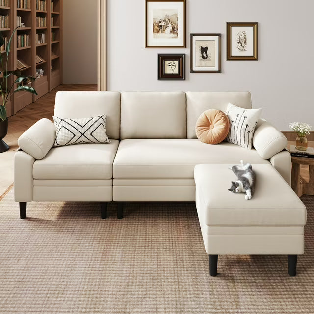 [Family-Friendly Safety]: Thoughtfully designed with rounded edges and made from non-toxic materials, this beige sectional sofa with ottoman is ideal for homes with children and elderly family members, reducing the risk of injury and ensuring a safe and healthy environment.