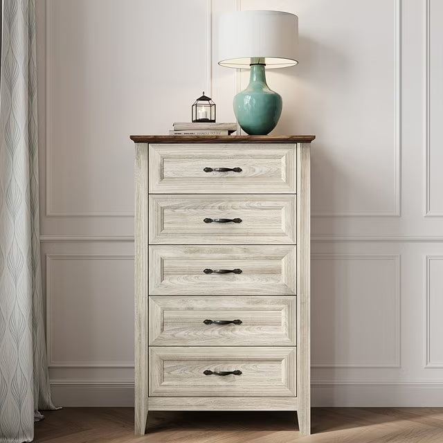 [Modern Farmhouse Style] - Featuring natural wood grain and elegant pull handles, this bedroom dresser exudes rustic charm and a timeless sophistication that effortlessly complements any decor. Its refined beveled edges and stylish drawer fronts enhance its vintage aesthetic, adding an element of grace to your home.