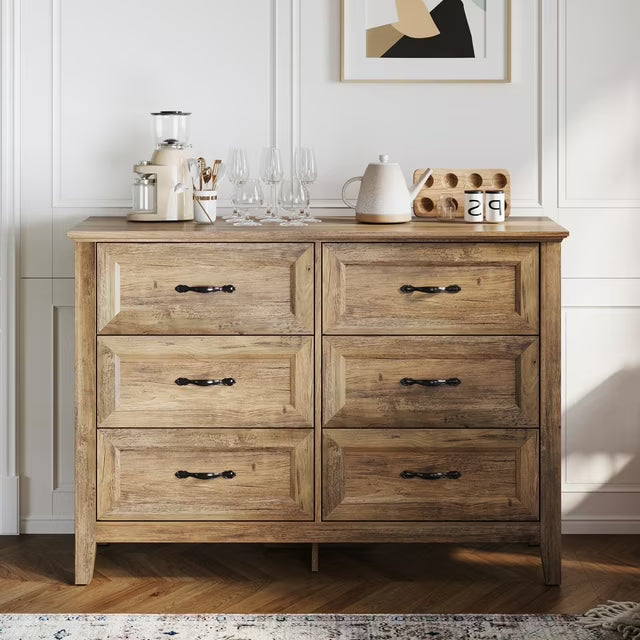 LINSY HOME Dresser for Bedroom, Long Dresser with 6 Drawers and Antique Handles, Chest of Drawers for Living Room, Entryway and Hallway, Rustic Oak