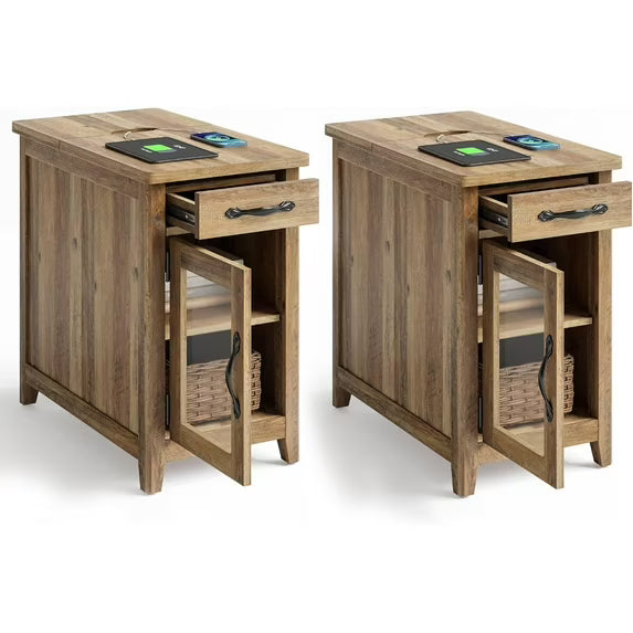 Enhance your living space with our exquisitely designed end tables for living room set of 2, combining modern elegance with rustic charm. These versatile end tables with usb ports and outlets are not just stylish accents but also practical additions to your home. Each table features a built-in charging station with three AC outlets and two USB ports, allowing you to conveniently charge your devices while reducing cable clutter for a streamlined, organized environment.The thoughtfully designed removable holder on each table provides a dedicated space for remote controls and small items, keeping them within reach but easily stowed away in the drawer when not in use. Crafted from sturdy engineered wood, these nightstand set of 2 bring both functionality and sophistication to any living room, bedroom, or office space.This end table is the perfect solution for enhancing the ambiance and efficiency of your living space, offering both practical storage and the convenience of built-in charging. Embrace the perfect blend of style and functionality with our versatile end table, designed to elevate your home decor.