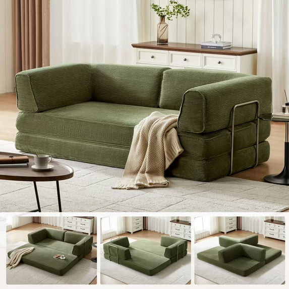 Looking for a sofa couch that feels as good as it looks? Meet the LINSY HOME Oversized Corduroy Futon Sofa Bed Couch—where cloud-like comfort meets everyday versatility.This isn’t just another loveseat sofa. With a quick reposition, it effortlessly converts into 4 unique modes—a cozy 3-seater sofa, a spacious king-size sleeper sofa bed, a relaxing double lounge, or even a floor recliner for gaming and movie nights. Plus, the removable L-shaped armrests let you customize your setup however you like.Wrapped in ultra-soft corduroy fabric, this folding sofa bed offers a plush, breathable surface that resists wrinkles and keeps its fresh look over time. Beneath the surface, a combination of high-density foam and fluffy cotton fill creates the signature “cloud couch” sensation—you’ll sink in gently, then feel perfectly supported as if you’re floating.Engineered with a 108° ergonomic backrest and reinforced steel frame supports, it’s built to ease tension on your back and neck while staying stable for years of daily use. The anti-slip breathable bottom keeps everything securely in place.Setup? Zero hassle. Thanks to vacuum-compressed packaging, just unbox, let it expand for 48–72 hours, and it’s ready to enjoy—no tools, no sweat. Perfect for living rooms, bedrooms, apartments, dorms, or offices, this convertible sofa bed adapts to any space with ease.