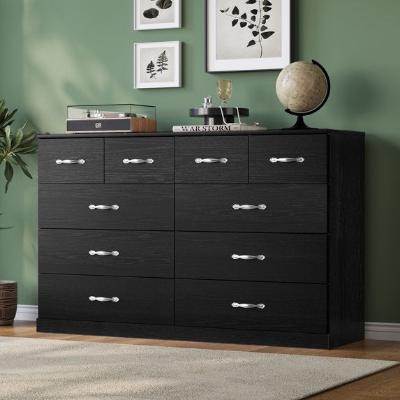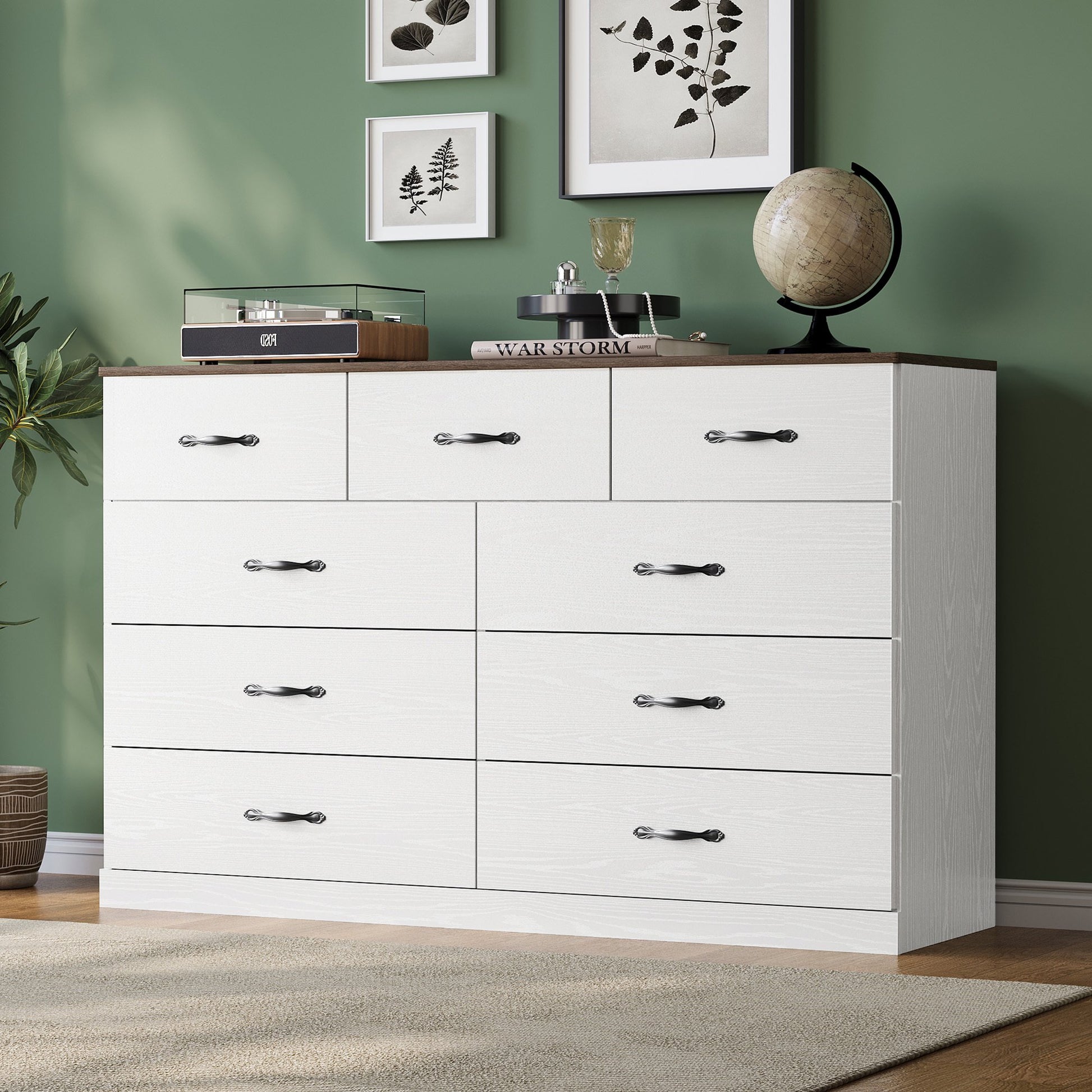 Elevate Your Everyday Storage – Modern Style Meets Practical Design.Discover the perfect blend of modern minimalism and functional utility with the LINSY HOME Modern Dresser with 8/9/10 Drawers. Crafted for contemporary spaces that value both form and function, this dressers for bedroom features a clean white and walnut two-tone finish that adds elegance and texture to any room—from bedrooms and closets to entryways and apartments.Built with premium MDF, durable P2 engineered wood, and a wear-resistant melamine veneer, our chest of drawers offers long-lasting quality and a smooth finish that resists scratches and daily wear. Its spacious design features up to 10 equal-size drawers, allowing you to organize everything from clothing and accessories to tech or linens. Plus, every drawer can be installed interchangeably for personalized flexibility.Safety and convenience are top priorities—rounded corners help prevent bumps and bruises, and included anti-tip wall anchors provide extra stability for households with kids or pets. The reinforced back structure and high-quality metal glides ensure the drawers open smoothly and hold up to 30 lbs each, while the thick tabletop supports up to 150 lbs — perfect for displaying décor, photo frames, or even a small TV.Whether you're furnishing a bedroom, dorm, or compact urban apartment, linsy home wide dresser adapts to your space beautifully — as a wardrobe, nightstand, console table, or hallway organizer. Stylish, sturdy, and thoughtfully designed, it’s everything you need in a storage solution.