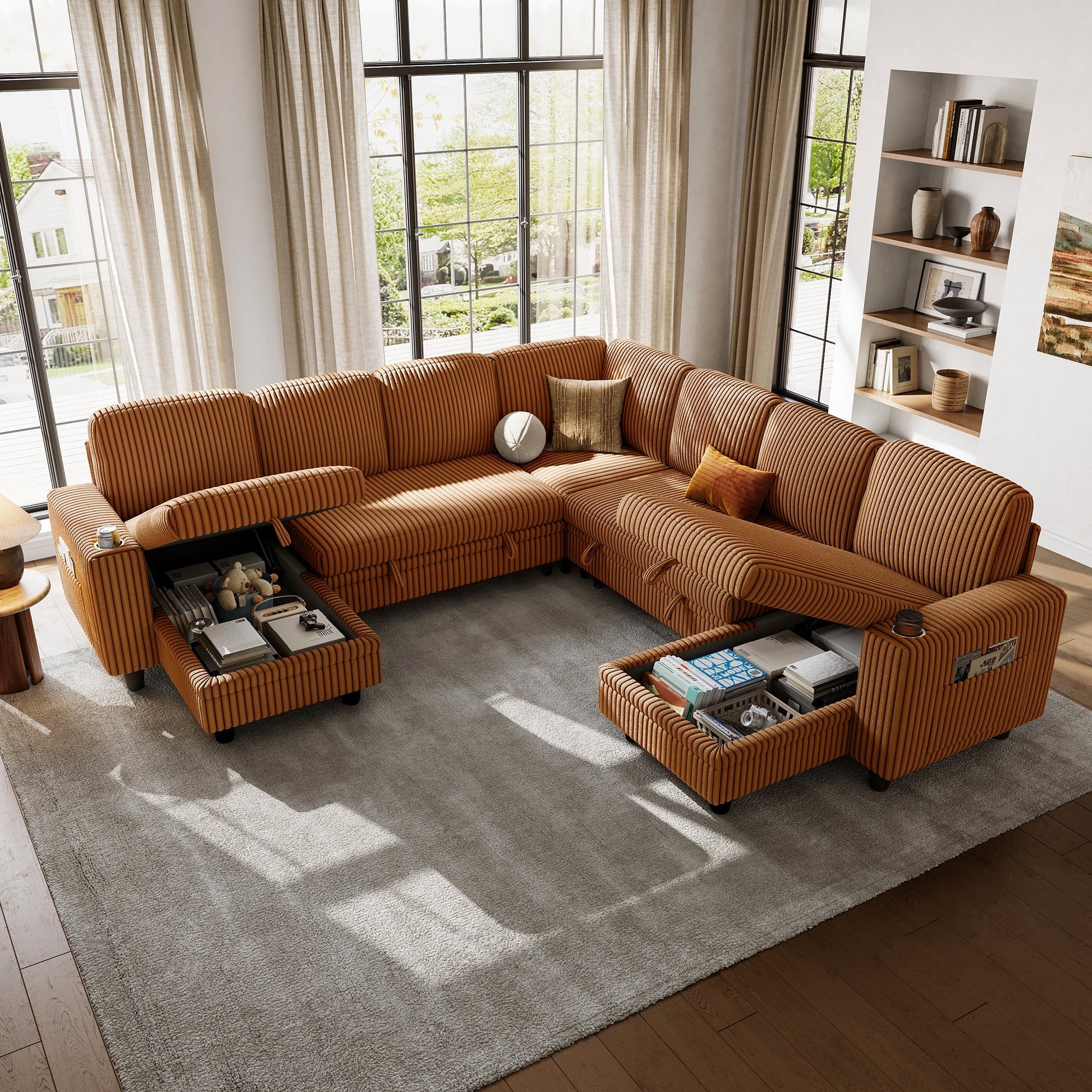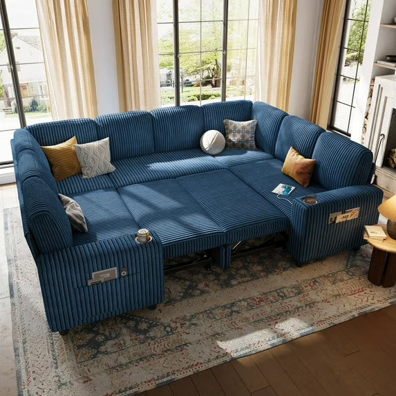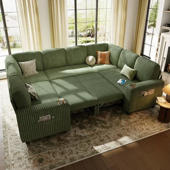 If you're looking for the perfect combination of comfort, functionality, and modern design, the LINSY HOME U-Shaped Pull-Out Sofa Bed is your ultimate choice! More than just a sectional couch, it easily transforms into a comfortable sofa bed within seconds, offering an ideal solution for overnight guests, movie nights, or daily lounging. With spacious built-in storage compartments and a user-friendly modular design, it’s made to fit seamlessly into your ever-changing lifestyle.Designed for modern living, our versatile sectional sleeper sofa features ultra-soft plush corduroy fabric that’s breathable, pet-friendly, and resistant to wrinkles and pilling. The luxurious high-density sponge and cotton filling, combined with a sturdy solid wood and metal frame, ensure long-lasting comfort and durability. The upgraded 7-inch wide armrests are equipped with built-in USB and Type-C charging ports, convenient side storage pockets, and cup holders on both sides, adding maximum functionality to your space.Whether you need a cozy spot to lounge, an extra bed for guests, or organized hidden storage, the LINSY HOME Pull-Out Couch Bed offers unmatched flexibility and everyday convenience.Easy to assemble without tools and highly adaptable to any room layout, it’s the perfect centerpiece for your living room, guest room, or apartment. Elevate your home with this all-in-one solution for modern comfort!