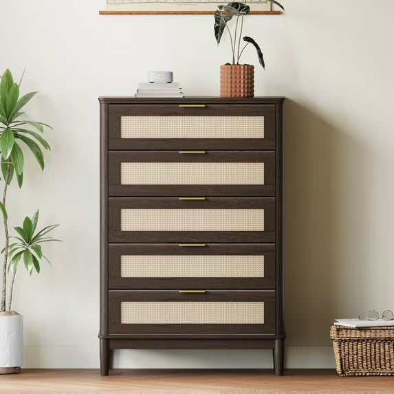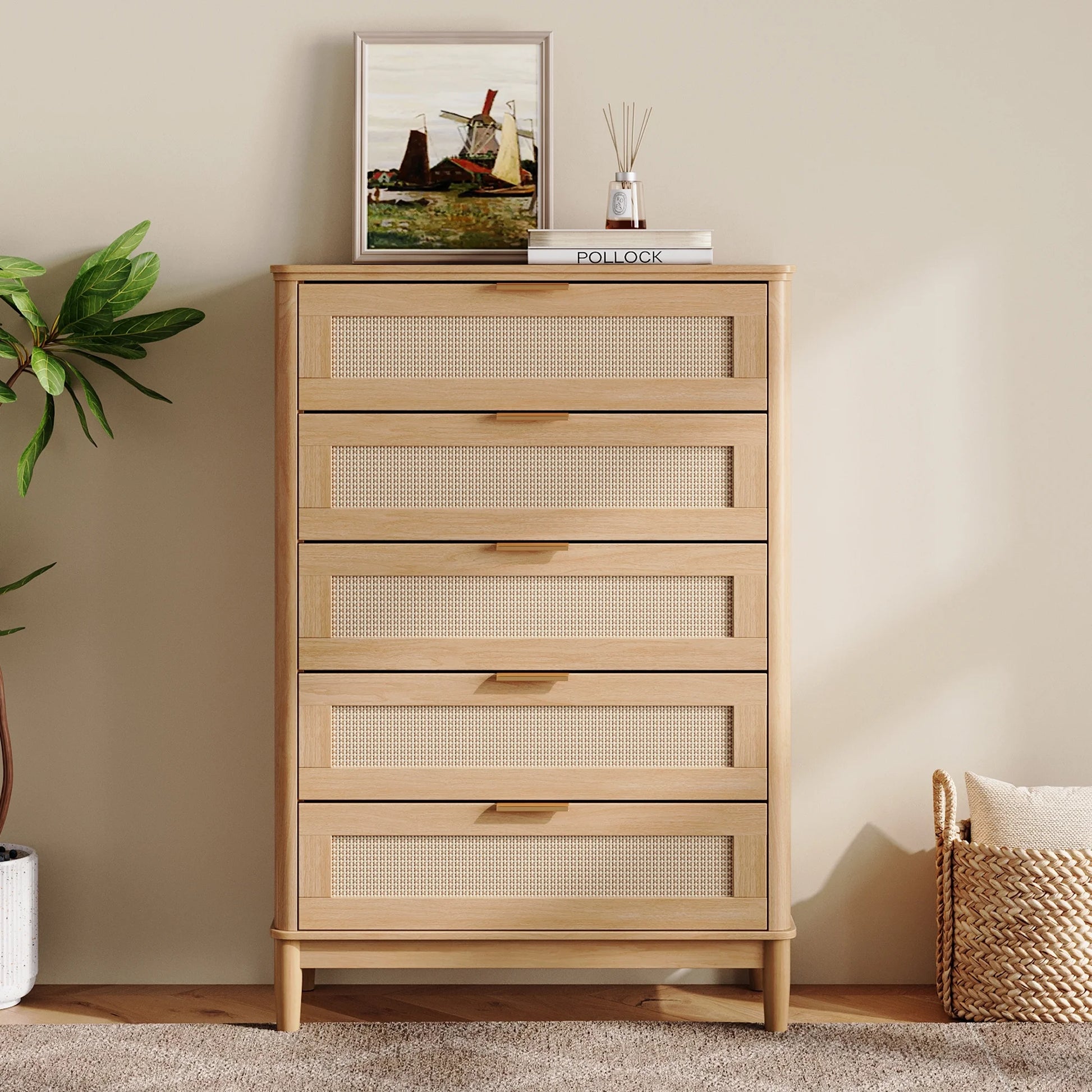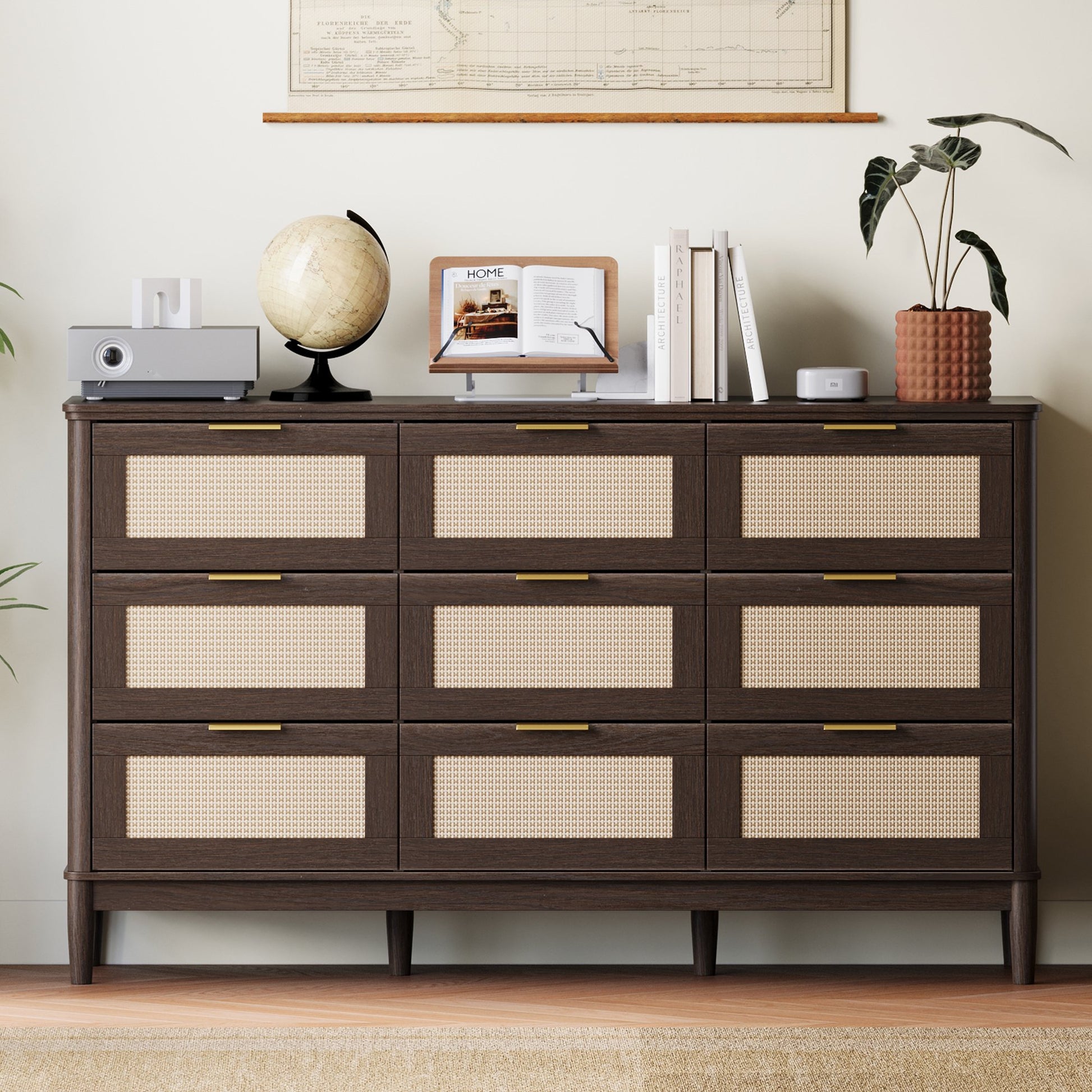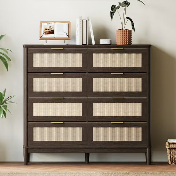 Bring breezy elegance and smart storage to your space with the LINSY HOME Extra-Large Rattan Dresser - a timeless furniture piece that blends effortless style with real-life practicality. Designed for those who appreciate a warm, organic look, this chest of drawers features woven rattan-style panels, decorative foil finish, and classic silhouettes that suit both modern boho and coastal-inspired interiors.With up to 9 spacious drawers and a thick wood-grain tabletop, it offers ample room for clothing, linens, accessories, and everyday essentials. The natural rattan texture, wide metal handles, and tall solid wood legs elevate the piece from simple storage to stunning statement.Unlike flimsy or outdated alternatives, this dressers for bedroom is crafted with durable P2 engineered wood, reinforced construction, and a scratch-resistant paper veneer/foil finish - built to stay beautiful and sturdy through years of use.Safety is thoughtfully built in - every bedroom chest comes with anti-tip wall anchors and a solid, wobble-free frame for peace of mind, especially in family homes. The elevated base keeps contents away from dust and makes it easy to clean underneath.Whether you're organizing a main bedroom, furnishing a guest suite, or adding charm to a small apartment, this versatile dresser fits right in. Use it as a wardrobe, media console, or entryway table - its adaptable design works anywhere, beautifully.