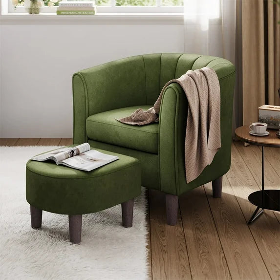 Transform your living space with the LINSY HOME Velvet Accent Chair with Ottoman - a perfect fusion of comfort and style. Immerse yourself in the sumptuous softness of velvet upholstery, while the living roomchair's ergonomic design ensures optimal support. The accompanying ottoman adds an extra layer of relaxation, creating an ideal spot for unwinding. Elevate your home decor with this chic comfy chair that seamlessly blends modern elegance and irresistible comfort.Experience an oasis of comfort with our Blossom Look Curved Armchair, boasting more generous seating, plush, thicker cushions, and an exquisite rolled edge. Upholstered in deluxe velvet fabric, this barrel chair exudes opulence, and the high-density foam guarantees a supportive and relaxing experience. Transform your space with this sophisticated and inviting seating option, enhancing both style and comfort.